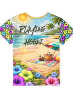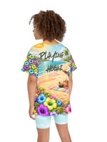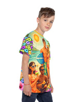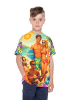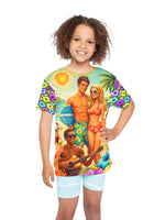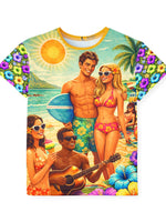 Sun-warmed and loud with color, this kids sports jersey brings beach day energy to every backyard run, match, or summer camp. The all-over print shows a retro seaside scene—surfboards, sun-drenched palms, and friends laughing to a guitar—wrapped in tropical blooms that pop with crisp, saturated inks. Lightweight and quick-drying, it moves with active kids and breathes through play. Slip it on for paddle games, poolside hangs, or that neighborhood tournament; the cheerful artwork helps carry the mood of long summer afternoons and impromptu beach parties.