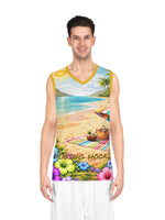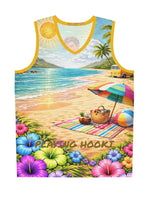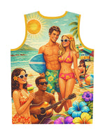 This vibrant basketball jersey brings summer to every court and hangout. Lightweight, breathable polyester keeps you cool as the sun-drenched beach print — complete with surfboards, tropical blooms, and a laid-back group of friends — wraps you in island energy. Wear it for pickup games, outdoor festivals, or weekend barbecues; the moisture-wicking, odor-resistant fabric and reinforced seams stand up to motion and repeat wear. Bright trim and edge-matched seam threads keep the design crisp, while the extra-light feel lets you move freely and comfortably under the sun.
