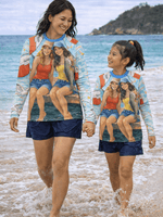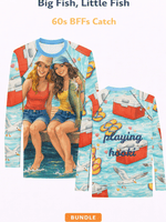 Our Big Fish, Little Fish Bundle packs must-haves rashies for together beach missions and water days — a comfy, long-sleeve rashies for sun protection... add matching bucket hats which are made to stay on through it all.