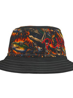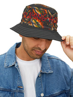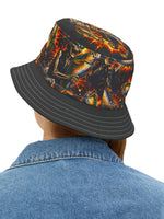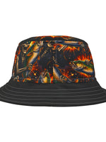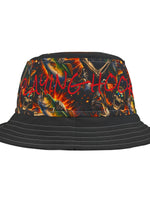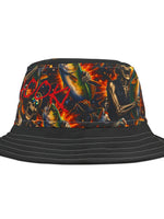 This bold bucket hat brings gritty, late-night energy to any outfit. The all-over printed crown features swirling, fiery graphics with pops of scarlet script for an underground, streetwise look. A sturdy polyester build and choice of stitching color give it a crafted, finished feel while the black brim grounds the design. Wear it to outdoor shows, city nights, or when you want an expressive layer that protects from sun and light rain. The three size options and sewn-in label make it easy to wear and keep.
