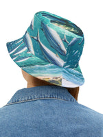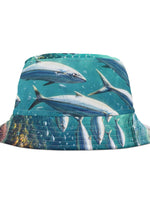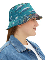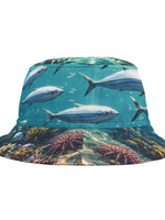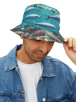 Dive into sunlit tides with this ocean-inspired bucket hat. The all-over print wraps gentle teal waters, darting fish, and coral textures around a classic brim, evoking slow afternoons by the sea and festival days with salt on your skin. Lightweight polyester keeps the shape crisp while soft stitching details add a handcrafted feel. Wear it for long beach walks, boat days, or when you want a splash of marine calm in your everyday look.