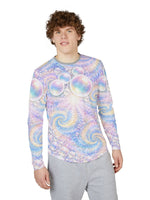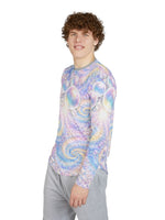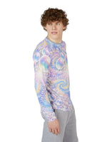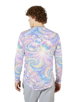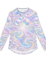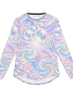 Float into sunlit waves with this long-sleeve UV protection shirt crafted for movement and open-air days. The airy fabric drapes light and cool against the skin while a pearlescent swirl of pastel bubbles and spiral motifs catches light with a soft, dreamy shimmer. Built to travel from shoreline walks to festival fields, the stretch-infused knit moves with you and keeps harmful rays at bay so you can stay out longer without the weight of heavy layers. Details like taped shoulders and hemmed edges make this piece feel finished and resilient — wear it under a pack strap or solo when the day calls for color and calm.