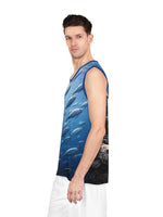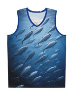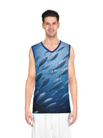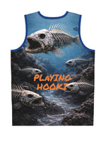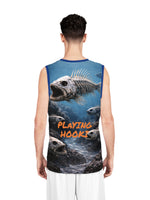 A lightweight, all-over print basketball jersey that channels the raw energy of the ocean floor. Deep-blue water and silvery schools of fish sweep across the fabric, while the back reveals skeletal fish and bold orange lettering that reads “PLAYING HOOK!” It feels like diving into a midnight reef — cool, fast, and a little wild. The moisture-wicking polyester keeps you dry through intense pickup games or long beach days, and the athletic cut with side seams maintains shape while you move. Wear it for scrimmages, surf breaks, or when you want a statement layer that speaks to saltwater riders and ocean lovers.