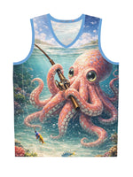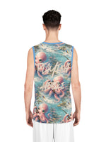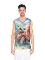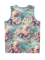 Dive into summer with this lightweight basketball jersey that brings playful ocean life to the court and the beach. A soft, airy fabric keeps you cool as you move while an all-over print of a curious pink octopus—rod in tentacle, wide-eyed and whimsical—adds personality to every play. The subtle sky-blue trim and repeated back pattern with layered script give it a fun, surf-meets-street style that works for pickup games, beach days, or casual hangouts. Wear it when you want something breathable that stands out without shouting. The odor-resistant, moisture-wicking polyester keeps you feeling fresh from warm-up to cooldown.